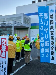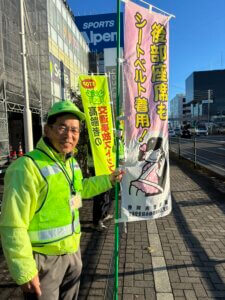 12/15 「年末の全国交通安全運動」出発式及び街頭広報がアルペン静岡石田店駐車場及びSBS通りで7時20分から開催されました。交通安全大使のOrange Leafさんと一緒にのぼり旗広報を実施しました。この日は地元ウエルシア付近での子ども見守り活動(旗振り)が出来ませんでした。